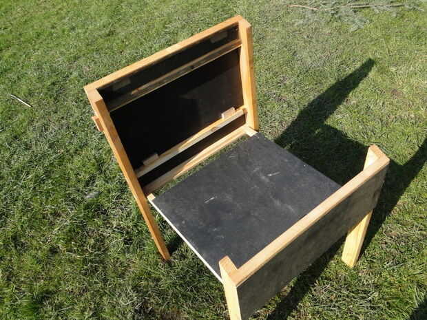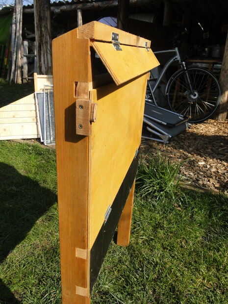 Ahora fije la parte inferior de la madera contrachapada (115mm) con clavos. Fijar las dos puertas (260mm y 58mm) con las bisagras. La puerta superior es para la regulación de la ventilación. Para poder ajustar la posición que se tiene que trabajar la articulación con el martillo o alicates para hacerlo bloquear ligeramente.