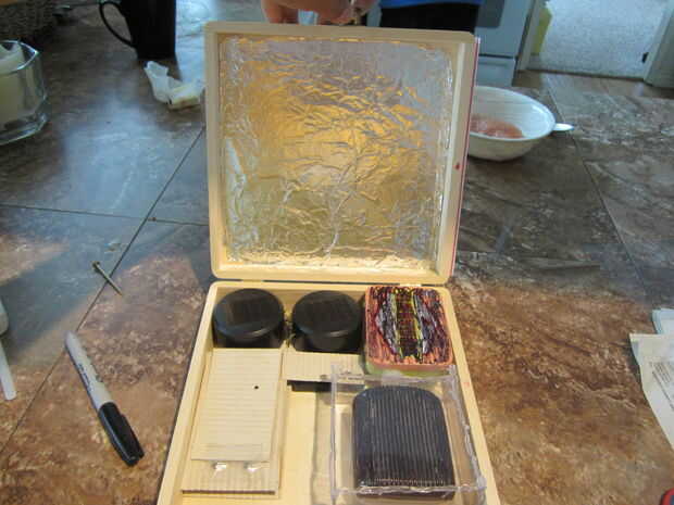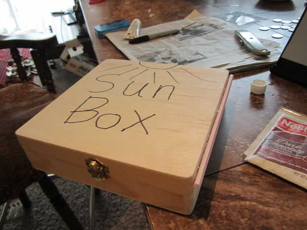 Esta caja aprovecha la energía del sol para acampar. En el desierto, usted generalmente no tiene electricidad para calentar agua o para cargar las baterías de la linterna. Generalmente usted tiene que utilizar un combustible para calentar el agua para el chocolate caliente, té, café o sopa. Los combustibles que usas probablemente no son ecológicos. Este diseño portátil le permitirá cargar sus baterías de linterna y un refresco caliente con el sol. También todo cabe en una caja.