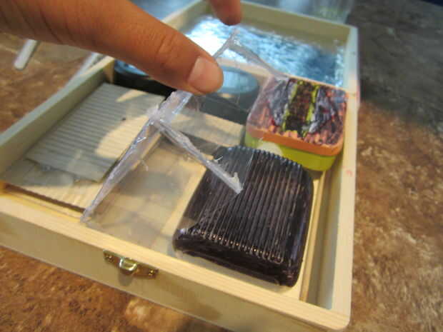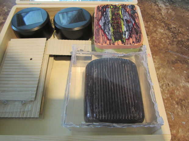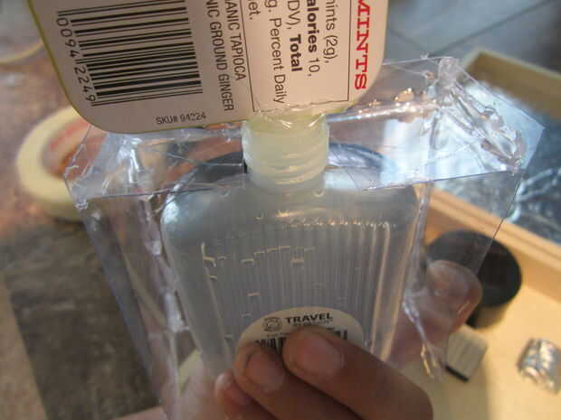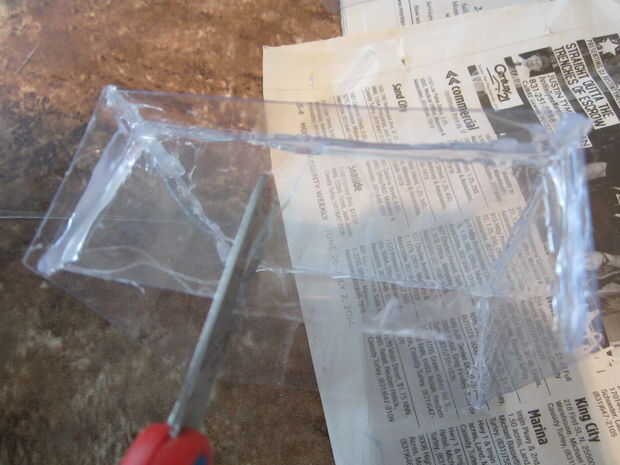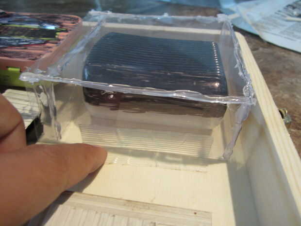 Ahora es el momento para hacer el invernadero pequeño para la botella. Corte cinco pedazos de la hoja de plástico transparente para que puedas hacer una caja transparente que se adapta sobre la botella. Pegar las piezas con pegamento caliente. Luego cortar una pequeña sección para que el cuello de botellas podría caber a través como se muestra arriba. Coloque la caja sobre la botella y la cinta de un lado del cuadro claro de la caja de madera que actúa como una bisagra. Este invernadero hace un efecto invernadero atrapando los fotones infrarrojos y gases calientes en la caja clara.