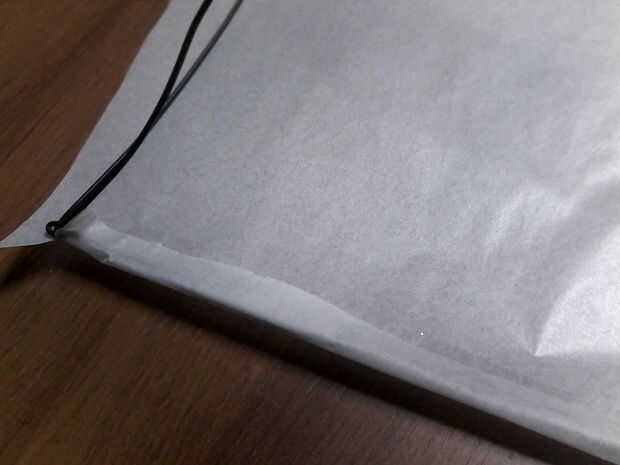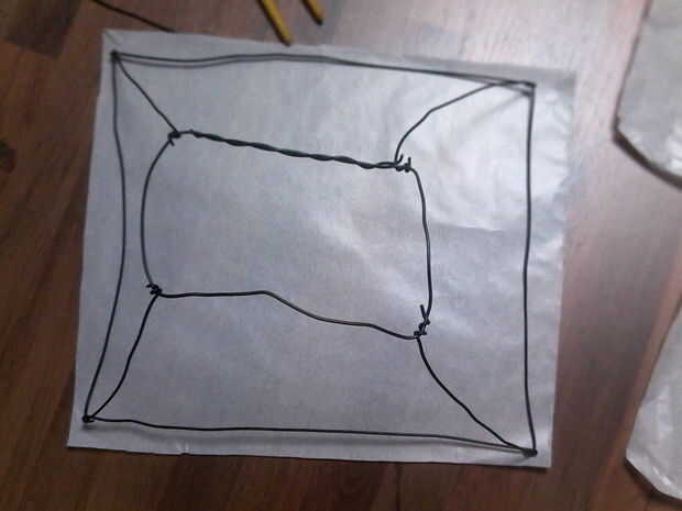 Cortar un pedazo de papel un poco más grande que el tamaño del rectángulo exterior. Hacer pequeños cortes en la esquina del papel. Cinta de papel alrededor del alambre.
