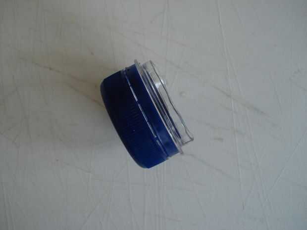 Cortar la botella de plástico con un cuchillo stanley. Ahora, usted tiene algo como la segunda imagen. Luego, corte con tijeras. Debe dejar algún plástico (duro) en la tapa. Si ha terminado, debe tener algo como la tercera imagen.
