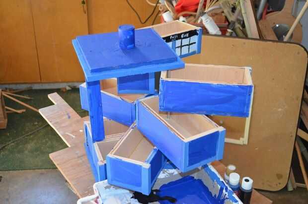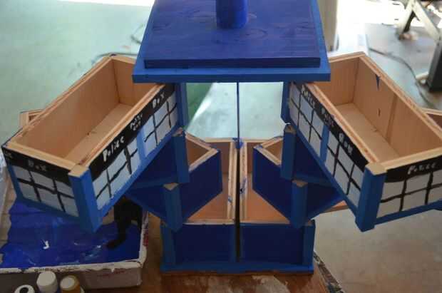 El tardis está hecha de 8 cajas pequeñas, distribuidas en dos pilas de cuatro. Cada pila tiene un árbol corriendo por la esquina, de modo que puede abrir como un abanico. Para abrir la caja, es necesario mover sólo el nivel superior. Los niveles de tres de las cajas (el nivel inferior es estacionario) tienen clavijas en la parte inferior que tirón las cajas inferiores. Una vez que el cuadro superior se ha convertido en un determinado ángulo, coge la clavija sobre otro, sacando así. Esto también funciona al revés, permitiendo que la caja para cerrar completamente girando sólo la parte superior nivel.
