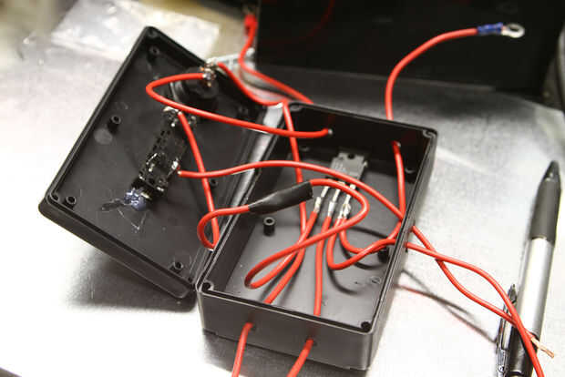 - Primer cable pasa a través de la caja de la esquina superior izquierda al interruptor I/O (este es el cable que pusiste en la + piscina en la batería)