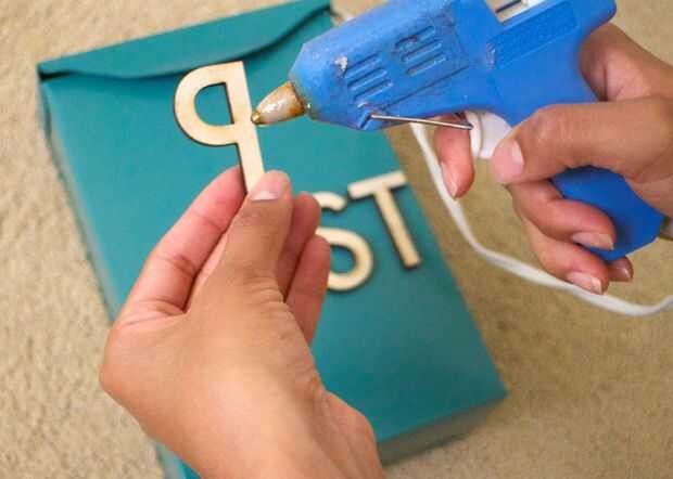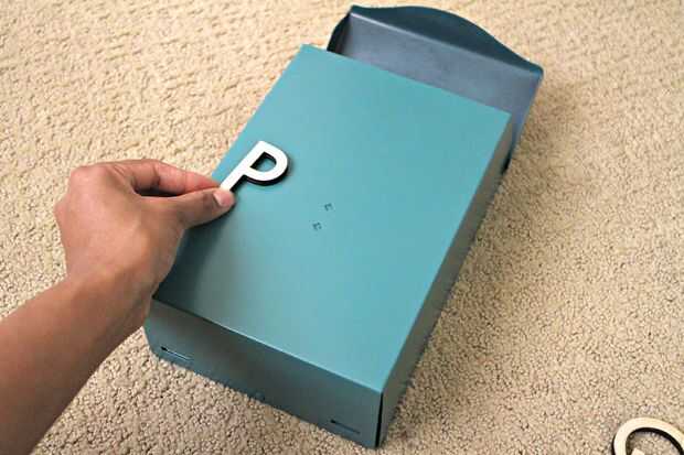Puedes encontrar Letras de mdf en su tienda de artesanía local (tuvo la suerte de tener una impresora láser a mi disposición). Decidí montar realmente la sensación vintage y eligió la palabra "POST". Caliente simplemente pegué las letras en el centro de la caja.