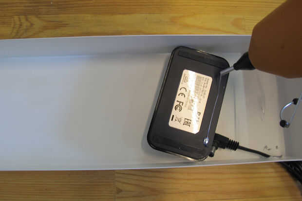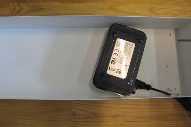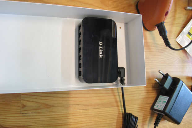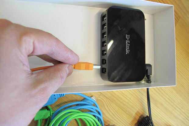 El hub USB dentro de la caja del pegamento y enchufe el cable de alimentación.