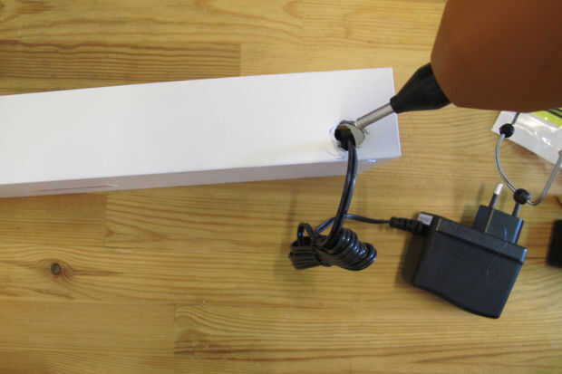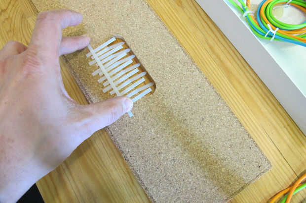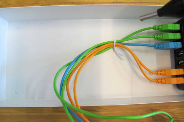 Sacar todos los cables a través del agujero en la tapa de corcho de este cuadro. Si usted no planea desmantelar esto recomiendo para pegar la tapa a la caja.