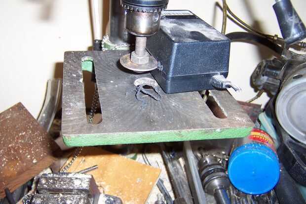 La ventaja de usar este tipo de herramienta de corte en una prensa del taladro, es que la corte y la mesa permiten tener una alimentación decente conduce el cortador y la tabla proporciona una superficie nivelada para permitir hacer un corte limpio y recto alrededor del caso.