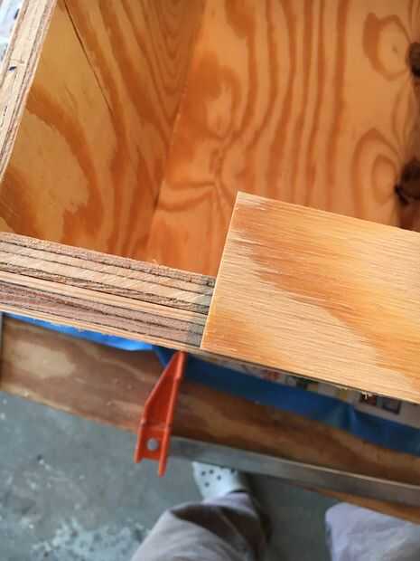 - Los extremos se unen sólo en la parte inferior y así lo requieren los tres tornillos de cabeza avellanada. Use pegamento para madera en todas las uniones.
