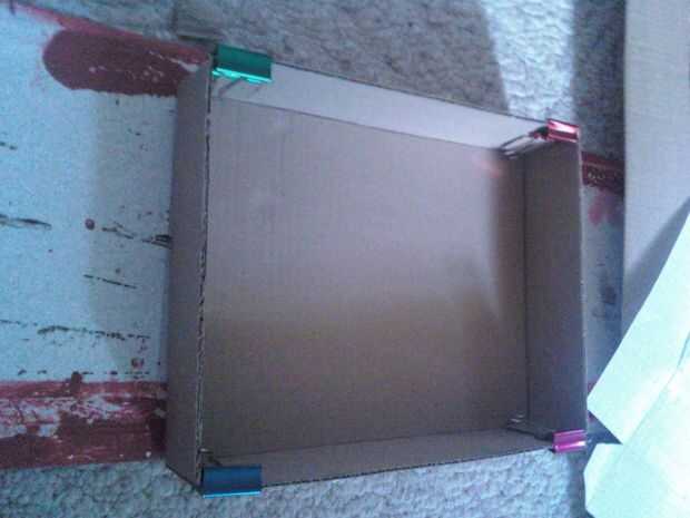 Una vez que la caja ha cortado y recortan de los bordes, doblar los lados a lo largo de las líneas de puntuación y pegar las pestañas a los lados más largos. Utilice cualquiera de los dos abrazaderas para facilitar la adherencia. Clips de la carpeta funcionan bien también. Deje que se seque antes de retirar los clips binder. Tiempo de secado dependerá de la humedad, tipo de cola y el tipo de cartón que utiliza. El tipo sin cera funciona mejor, pero es bastante simple.