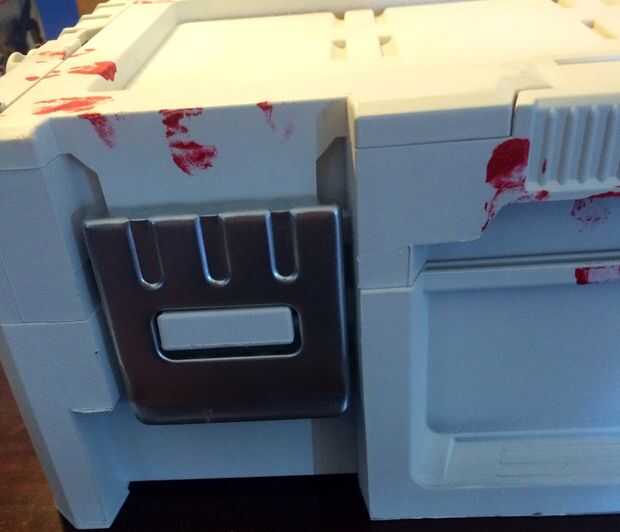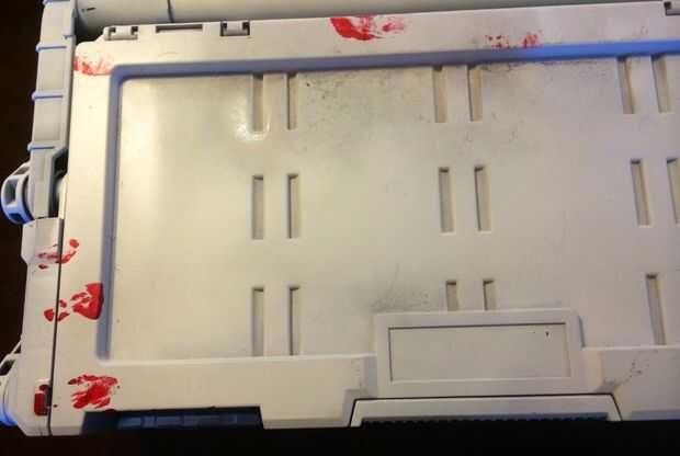 He utilizado pintores cinta de las patillas de acero en la parte delantera. Luego hice dos capas de la pintura en aerosol Krylon plástico adhesivo. Una vez que la pintura se había secado usé una pintura acrílica base de agua en mis manos agregar algunas huellas dactilares en la caja.