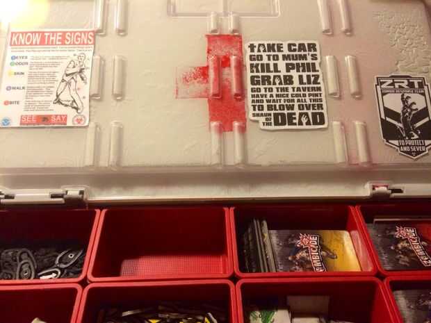 Más de las etiquetas engomadas apliqué dentro y fuera de la caja. Tenía diversos grados de éxito con las pegatinas en el exterior de la caja. Con la pintura en aerosol lo utilizado poner una textura ligera en la caja, que causó las pegatinas no desea se pegue correctamente.
