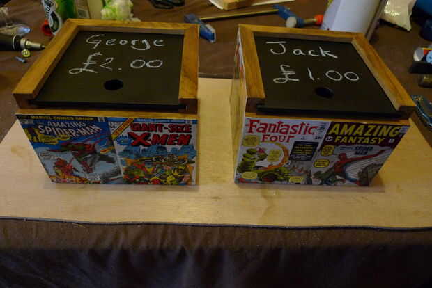 Quería hacer un par de cajas de dinero para mis hijos y un repuesto de poster de marvel así que decidió que haría un cómic revestido de dinero de caja para cada uno de ellos. Reciben £1 a la semana y 20 peniques al día, con el día uno ser un incentivo para comportarse... bueno espero que de todos modos (que son 5 y 7 por el camino y no crecido ups!)