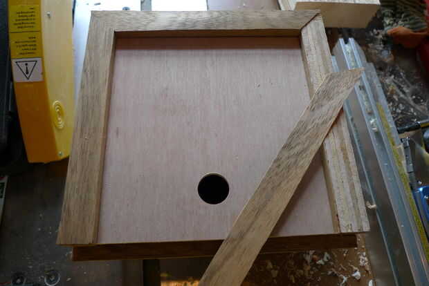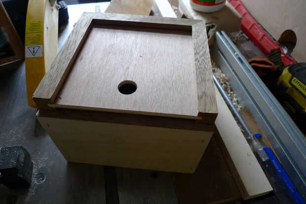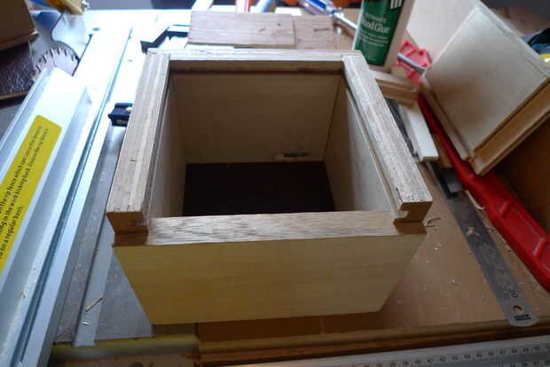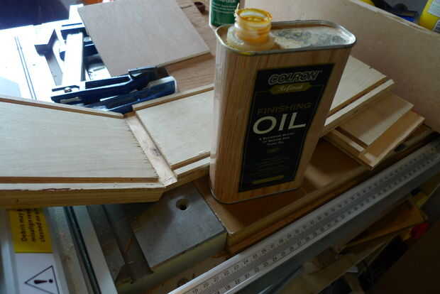 Después de chapar el panel pude poner la caja juntos. Antes pegué todo he añadido una capa de aceite acabado en el interior ya que sería más fácil hacerlo ahora que más adelante.