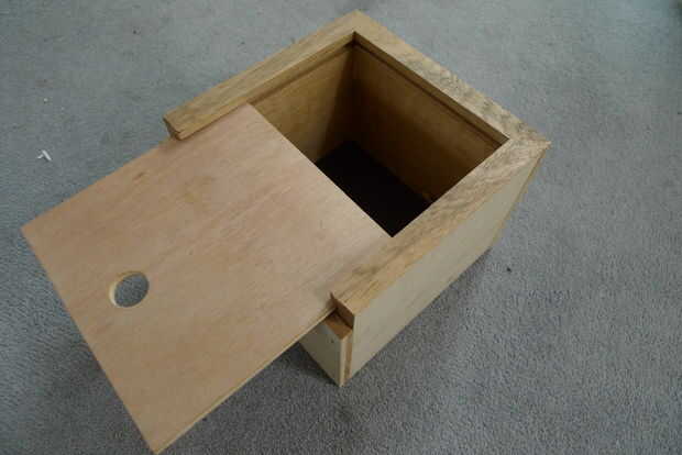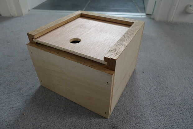 Una vez terminado he determinado el tamaño de la tapa deslizante y cortar el capas a la medida. He añadido un orificio con un poco de fostner, en la parte superior para que la tapa se puede deslizar fácilmente con el dedo.