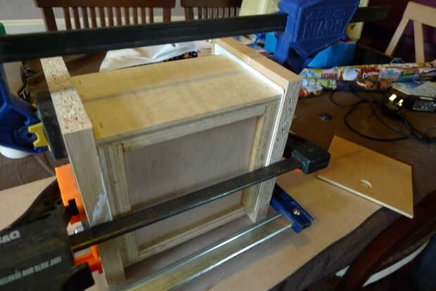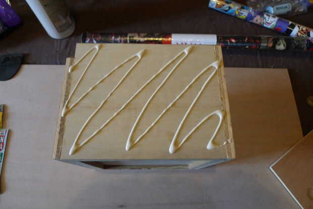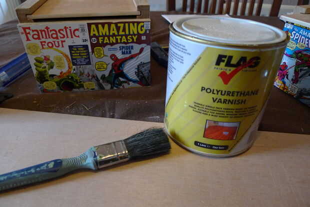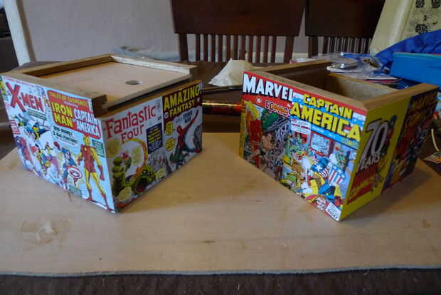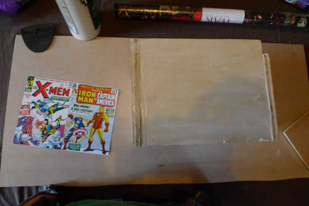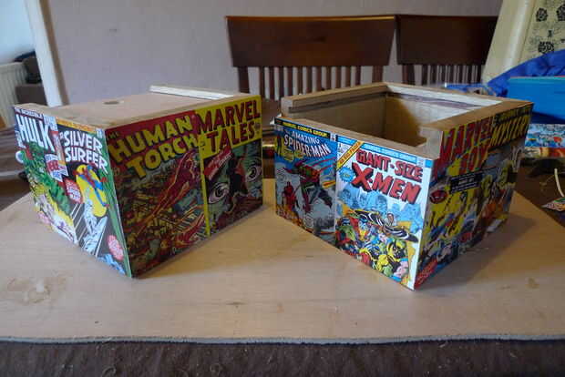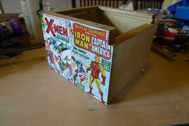 Corté el cartel cómico de a 4 piezas de cada caja levemente de gran tamaño y pegados dos lados opuestos a la vez así que lo pude arreglar a los tebeos a la caja con algunos restos de madera. Esto funcionó bien ya la madera hizo una buena base para cortar los solapes de los tebeos en apretadas no movieron cuando estaba cortando, por lo que era capaz de producir un borde limpio agradable.