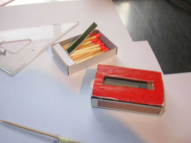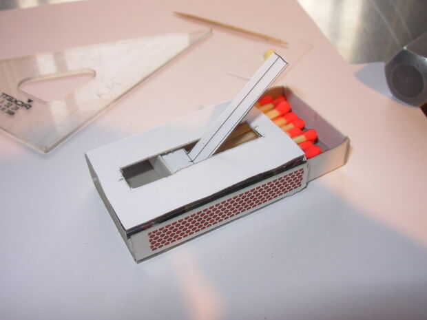 Si utiliza papel decorativo este es un buen momento para pegar a la caja de cerillas. Ten en cuenta que cuando apareció todas las piezas del mecanismo será visible. Colorear con un rotulador o pegando papel más decorativo a la superior y parte inferior del empujador y emergente le dará un mejor aspecto que la acción blanca llana.