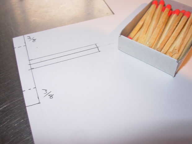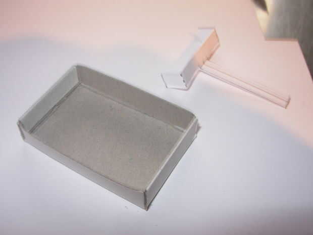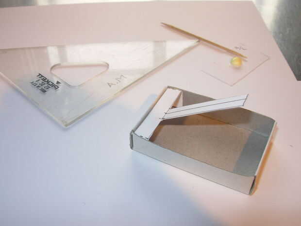 Doble la pieza de empuje corte como se muestra a continuación. Después de doblar el pegamento el patas cortas de la sección de U a la caja de cerillas interior.