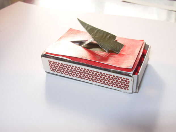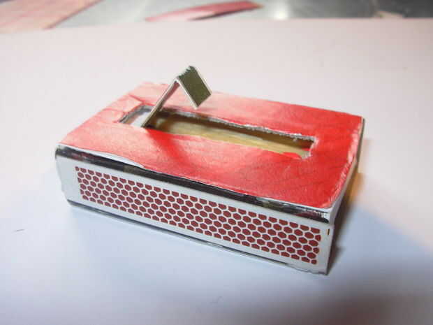 Coloque la capa emergente en la caja de cerillas y utilice las pinzas para sujetar el brazo de empuje en la parte inferior de la ventana emergente. Para un minuto o 2 para el pegamento se establece. Asegúrese de que la otra parte de la capa emergente es encolar bien y apartar la pieza durante 5 o 10 minutos. Usted será tentado a probar el mecanismo emergente, pero espere hasta que el pegamento se encuentra totalmente o probablemente tendrás que pegar en su lugar una segunda vez.
