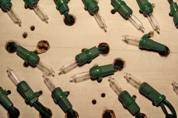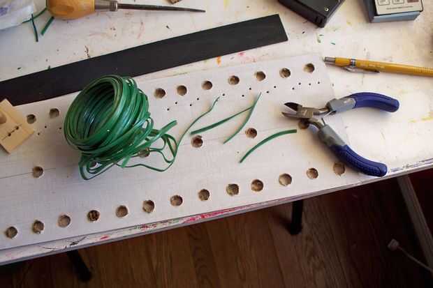 Esto es simplemente un trozo de cartón cortado para caber dentro de la caja. Perfore agujeros de 3/8 de pulgada para cada lámpara, inserte las lámparas en estos agujeros y atar la lámpara con plástico alambre cubierto que se utiliza en proyectos de jardinería y flores.  Un agujero se corta en la parte inferior derecha de la caja para que el cable se pueden encaminar hacia la parte posterior y no interferir con la placa.