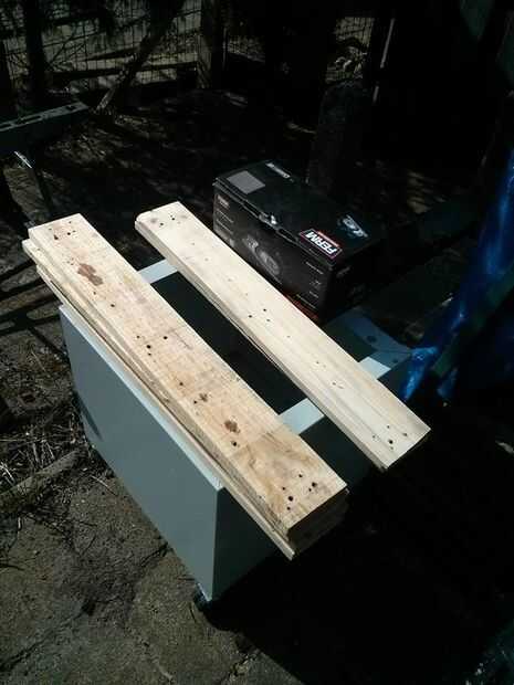 5. cortar las tablas por la mitad y mide 35 cm para las últimas piezas y otra vez. Así 2 pegadas juntas me dieron 4 piezas de 35 cm. Puse éstos en la forma de un cuadro, utiliza piezas de ángulo para cuadrado, lo sujeta a, taladrar agujeros piloto, atornillados juntos y puesto encima planchas de madera finas desecho.