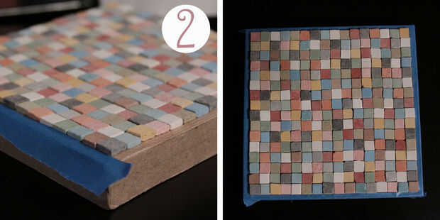 * Consejo: Para mantener color de colocación en la lista utiliza un objeto plano grande y coloca sobre la parte superior de mi tapa. Muy rápidamente volcó la tapa, transferir el diseño a la superficie plana, dejando la tapa con cinta libre de trabajar con. En algún momento tuve que volver a arreglar algunos de los azulejos pero esta es la mejor manera para el movimiento de la superficie manteniendo el diseño que usted pasó tiempo creando.