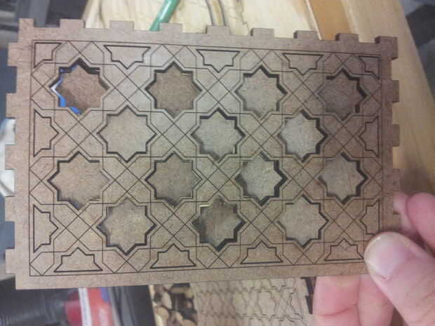 La primera imagen es del cortador laster en proceso y la segunda imagen es del proceso terminado conmigo saltando las piezas completamente cortadas.