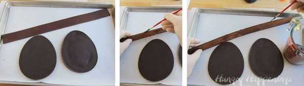 Ahora quieren colocar la tira de modelar chocolate a uno de los huevos de chocolate. Elegir el huevo chocolate mirando más bonito que la parte superior de su caja.  Sumerja un pincel de punta fina en chocolate derretido y pintura a lo largo de un borde largo de la tira de modelado de chocolate. Trabajar con rapidez, para que no endurezca el chocolate.
