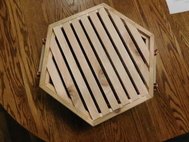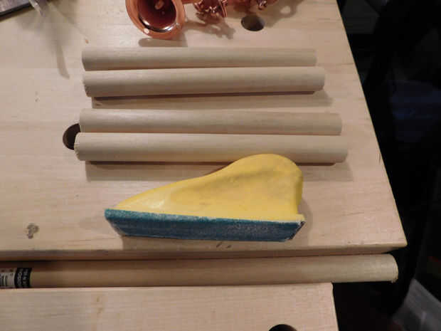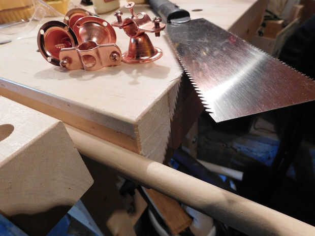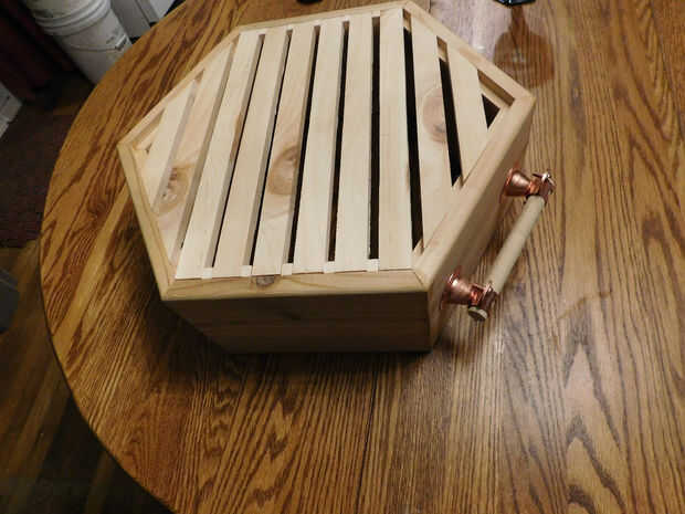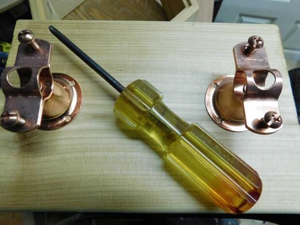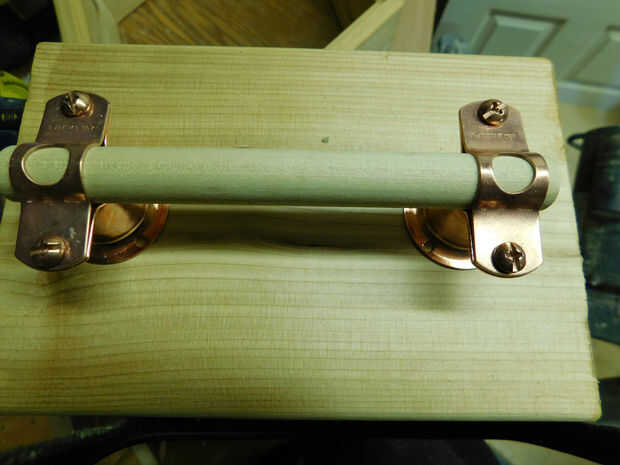 He buscado para manijas usando tacos roble ya que es lo que tenían en mano y pensó que podía hacer que algo funcione. ¿Adivina qué? He encontrado la solución perfecta, en Instructables. Herramienta cuadro de Divas hizo este tratamiento de mango fresco con tacos y ganchos de la campana de cobre. Genial! He escalado hacia abajo un montón y no podía estar más contento con la funcionalidad y estética.