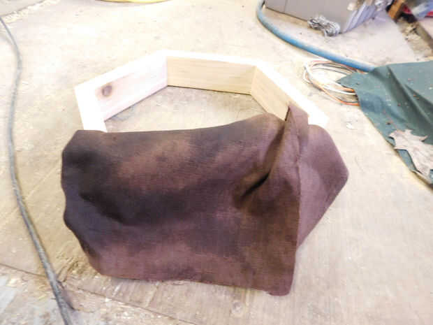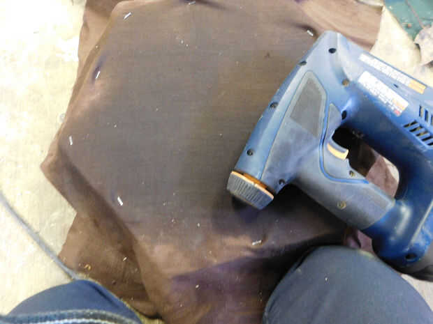 ~ Método de grapado es similar a la tapicería; trabajo de opuestos lados para estirar más aún. No tramo/tire demasiado, sólo lo que se siente natural, empujar tan duro como sea posible, para garantizar la completa y descarga entrada de la pistola de grapas a la madera.