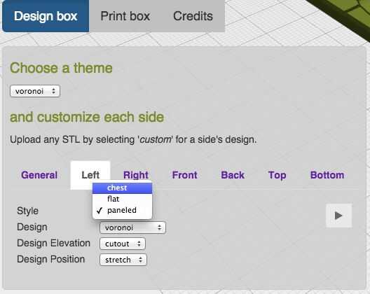 Boxification viene con un conjunto de cajas 'temas' para empezar. Pruebe a seleccionar temas para tener una idea del tipo de cajas que se puede crear. Temas, sin embargo, son sólo el punto de partida. Puede altera las dimensiones de la caja y personaliza el aspecto de cada lado individual. Utilice el ratón para girar y mover el cuadro.