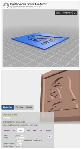 Puede utilizar cualquier archivo STL como un diseño de lado. Los archivos STL ideal no son excesivamente complejos (para reducir tiempos de procesamiento), y debe ser una altura uniforme (o casi uniforme). Vamos a utilizar un Darth Vader y Yoda STL archivos de Thingiverse como los lados derecho e izquierdos de la caja.