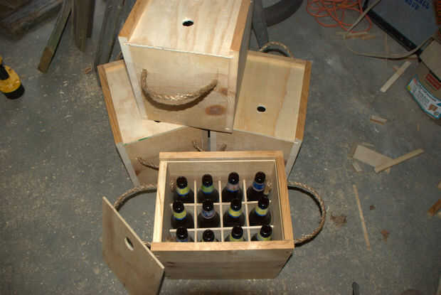 Suponiendo que tienes alguna cuerda, pegamento y tornillos por lado $20 es suficiente para hacer dos cajas con muy poca madera residuos sobrantes. Estos cajones cada uno 12 botellas y son lo suficientemente robustos para tomar una paliza pero no son tan pesados que una persona no puede llevar a dos de ellos al mismo tiempo. También añado que estoy no hay donde cerca suficiente de un carpintero para hacer algo super exacto, como gabinetes o ángulos de 90 grados. Así que si puedo hacer estas cajas así que se puede. Me tomó cerca de 3 horas para hacer dos cajas incluyendo el tiempo que se tardó en tomar todas estas imágenes. Estoy seguro que alguien que tiene incluso la más mínima pista sobre lo que están haciendo podría hacerlos aún más rápido.