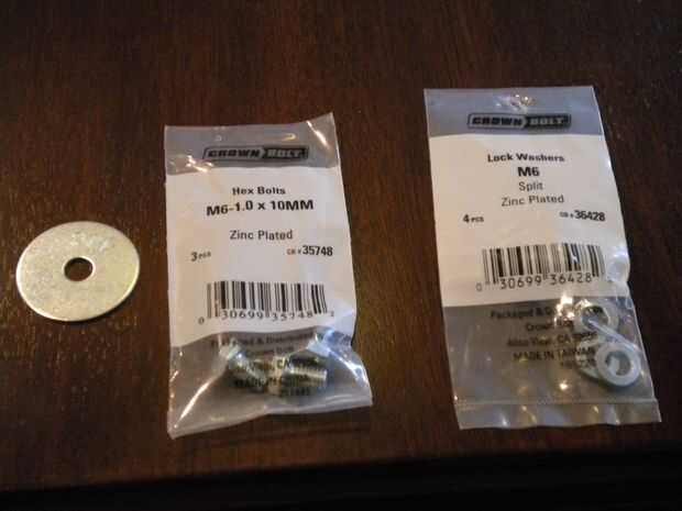 M6-1.0 x 10 mm hexagonales pernos y arandelas de cerradura M6 1/4 "x 1 1/4" arandelas de defensa de The home depot (utilicé este hardware ya coincidía con los pernos de las roscas en los imanes que compré).