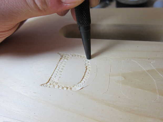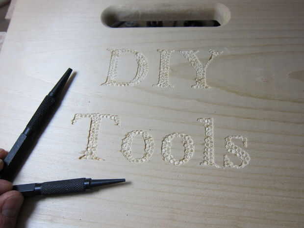 En un principio que iba a tallar las palabras pero luego vio que mi herramienta de talla muy todo sordo de otro proyecto (talla un conejo de jack en mi stock de rifle 22LR) así que decidí ir con una solución de gorjeo de acaba perforando el diseño en. He utilizado herramientas de golpe tuve que poner todo pero podría tener uso apenas sobre cualquier cosa, como: clavos, destornillador, cuchillo o cualquier cosa lo suficientemente pequeña en diámetro para el trabajo. Me tomó alrededor de 5-7 minutos hacerlo.