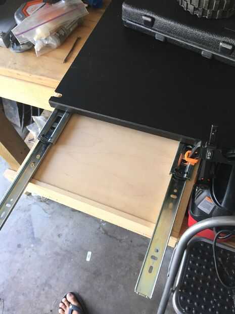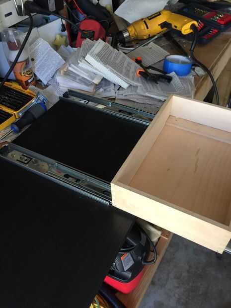 Realmente no hice este paso en este orden porque soy terrible en la planificación, pero recomiendo hacer este paso ahora. Instalar las diapositivas en el gabinete debe ser bastante fácil, si lo hace en un gabinete estante como yo, toma la cosa y tornillo diapositivas en tanto que seguro que está paralelo. Colocar el portaobjetos a la caja es un poco más complicado porque una vez que coloca la caja donde yo quería, no podía ver los agujeros donde necesitaba perforar.