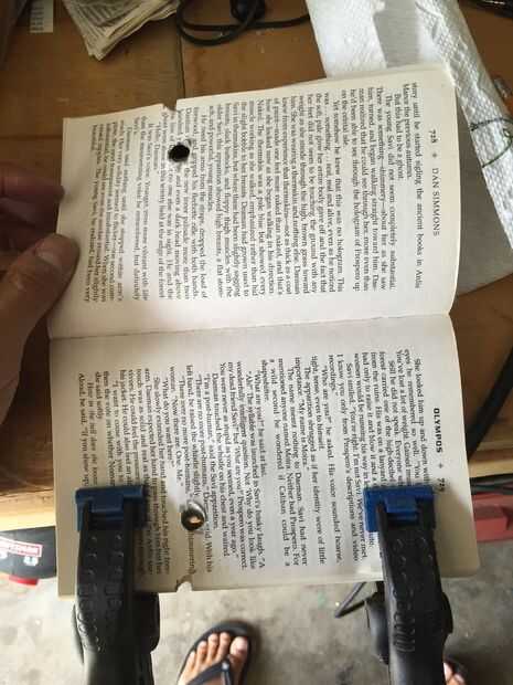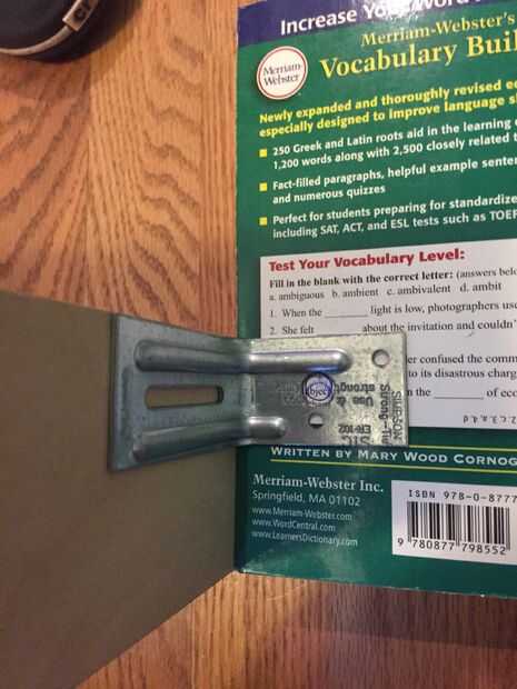 Este libro será de ahora en la plantilla del agujero. Tome el siguiente libro en orden y alinee la parte posterior e inferior, tal como sería ser alineado en una estantería. Sujete los dos libros juntos en ambos lados del libro plantilla de agujero y luego sólo tiene que utilizar la plantilla para perforar directamente a través de otro libro. Easy peasy. Seguir haciendo esto hasta que todos sus libros son tan santos como la Biblia o el Corán (yay, retruécanos lame más. ¿Es ofensivo? Pido disculpas si es... Soy delirante de escribir todo esto en una sola vez). Si el perno es muy similar a la broca, puede que necesite hacer unos perforación pasa para ensanchar el agujero para que deslizan fácilmente, los libros porque es difícil bajarse si el agujero es demasiado pequeño.
