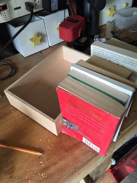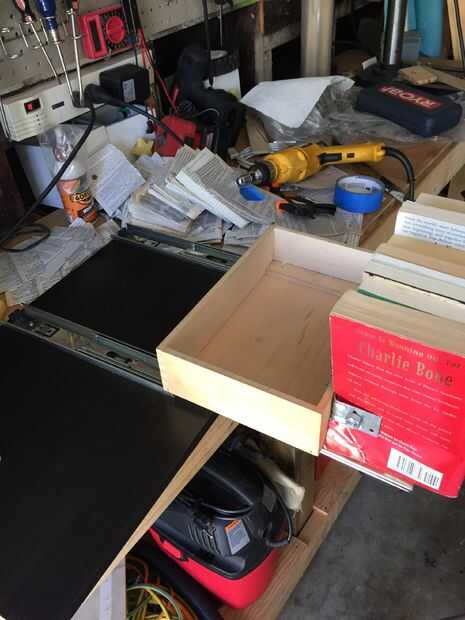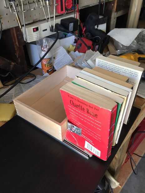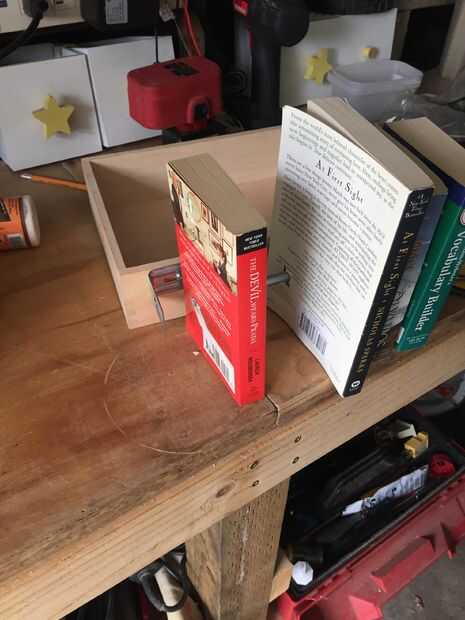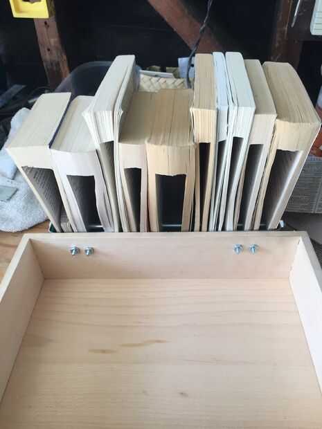 Todo lo que queda es pasar el perno por los agujeros de los soportes y los libros y ver si todo encaja. Anímate y prueba a ver si los libros de interfieran con el movimiento deslizante del cajón, porque ahora es el momento para arreglar eso. Esperemos que ajuste sus medidas y no necesitará comprar ningún libro más, pero no será demasiado duro si es necesario.