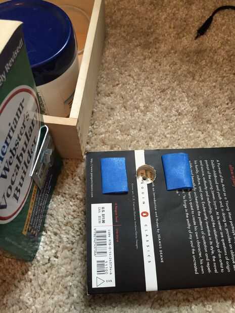 Para cubrir los soportes en los extremos de la línea, sólo rodar alguna cinta y poner alrededor de los orificios que ha perforado y pegarlo junto a los soportes. Para completar la ilusión de una estantería, usé cinta algunos claro los libros de final cerrados para que las cubiertas accidentalmente no vuele por todas partes y revelar mi cajón secreto.