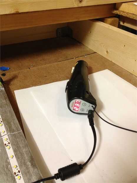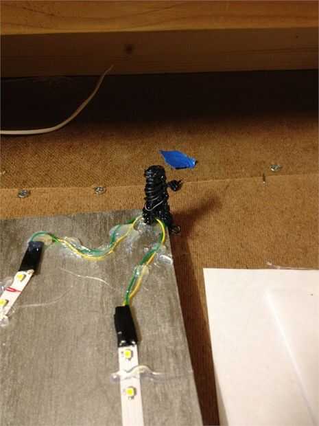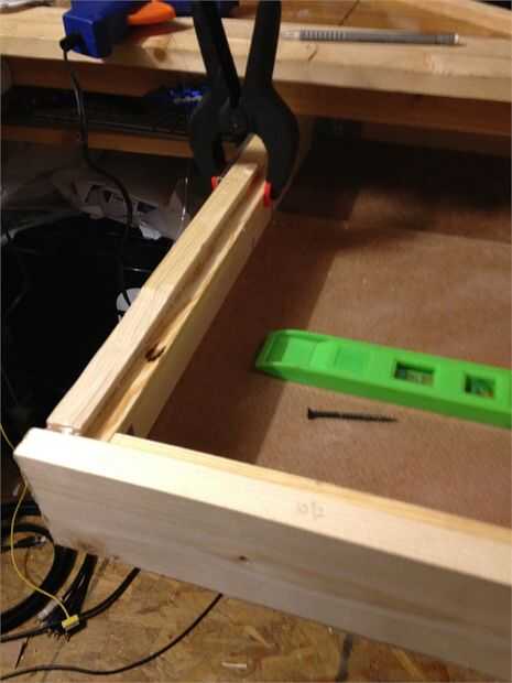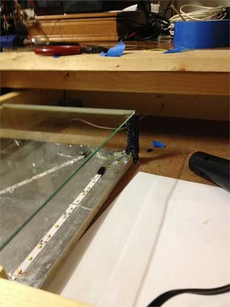 OK, entonces tengo mi vaso y tengo mis luces y mi cajón, ahora tengo que agregarlos todos juntos. Medido y me coloca una tira pequeña de madera en el cajón como parte de un marco para poner el vidrio sobre. Puesto que esto iba en la esquina del cajón, sólo tenía dos muros (frente de la repisa) y costado de la parrilla. Pude han construido dos extras muros y pintado plata también, pero por alguna razón, estaba pensando que quería que permanecen abiertas. En retrospectiva, que no estoy seguro que era necesario, pero ese fue mi pensamiento en el momento.