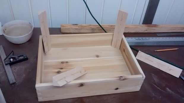 Esta parte siguiente fue difícil. Quise utilizar apoyos cuadrados (como se ve en el dibujo original) pero alguien me dijo que llegaría mucho más espacio fuera del cajón mediante diagonales. Estar limitado en herramienta y no tener una hoja fina con mi sierra de mesa, usé mi sierra para cortar ingletes y apoyo simple para cortar a 45. Tomó unos cortes en diferentes lados y un montón de lijado, pero los resultados fueron que vale la pena.