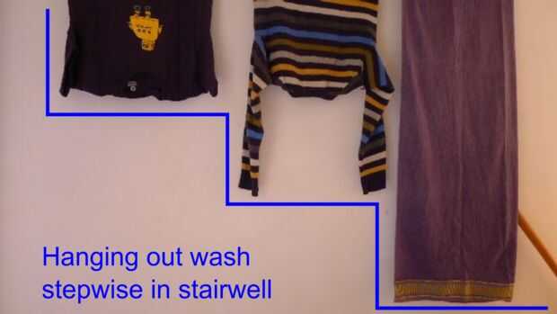 Por la colocación de la rejilla en el extremo superior de la escalera y colgar la ropa step-wise (ver imagen) este doble uso del espacio no proporciona ningún tipo de molestias al subir y bajar las escaleras.