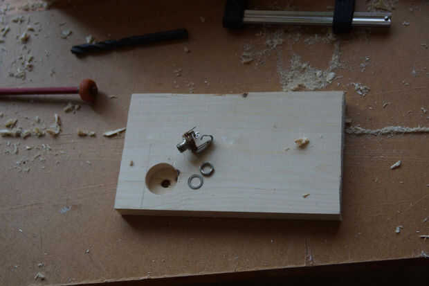 El montaje de chasis utilizado aquí necesita realmente solamente un agujero de 9 mm de diámetro. Sin embargo el hilo de montaje es mucho más corto y necesario para el espesor de la madera. Haciendo a un lado del agujero mucho lager. lo que es capaz de sostener la parte base de la montura y hacer el grueso de madera lo suficientemente delgado como para el montaje en chasis. Otra ventaja de a partir de trabajo de dos lados es que tienes menos posibilidades para saltar feo.