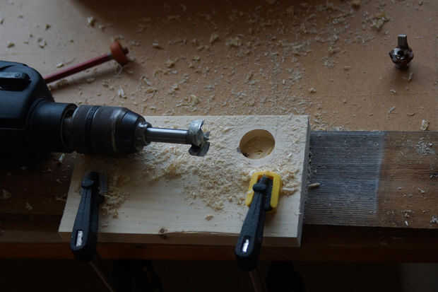 Después de con una taladradora y la broca Forstner de 30 mm, se hace la mayor parte del agujero. (Aproximadamente 14 mm de profundidad en 18mm creo de madera). Esto puede hacerse también con una pala de madera poco, sin embargo, que tiene un punto centrado mucho más grande que hace más difícil conseguir un buen acabado en el agujero de 9mm en el exterior