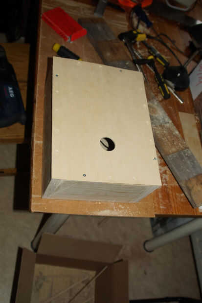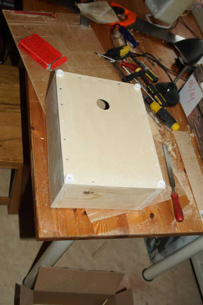 Esto permite sustituir y moverse el elemento piezoeléctrico. También he hecho el agujero de sonido en este tablero. Esto hace posible experimentar con eso, sin la necesidad de reconstruir el cuadro entero, solo la placa de madera contrachapada. Una parte menos importante pero en la decisión de tener la boca en la parte inferior tiene gatos que les gusta tho juego con hilos o alambres. Menos posibilidades de ellos llegar y romper la parte eléctrica de la caja.