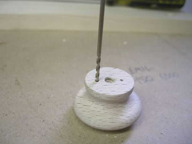 El hoyo debe ser bastante profundo en la perilla--taladro hasta tendría que ir que dejaría aproximadamente 1/4" de madera perforadas evitando penetrar completamente la perilla.