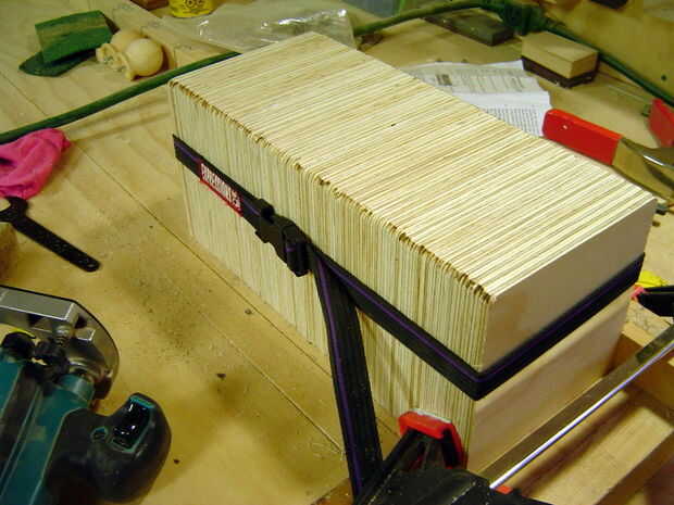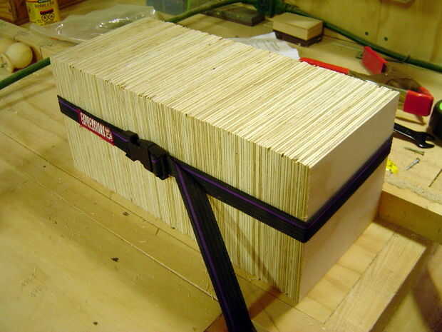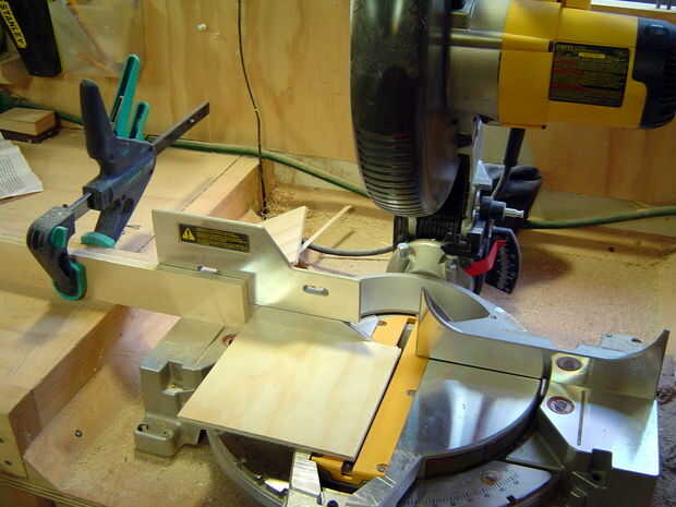 Medí cada cubie de 19,1 mm un lado y cada etiqueta como 15,6 mm, alrededor del 81% del tamaño. Había redondeado hasta cerca de 5 mm (165 mm para un "sticker" para una cubie 200 mm) y me arrancaron mucho de una sola hoja de madera contrachapada de 1/4" en tiras de 170 mm. I luego conjunto una parada en mi inglete vio a 165 mm y dos cortes para cada plaza, para que las 54 plazas eran como cerca de perfecto como sea posible. I había asociado con una correa y enrutados y lija en las esquinas de las plazas todas simultáneamente. Este paso fue muy rápido, y todos los componentes se hicieron ahora. ¡ Pintura y hardware para ir!