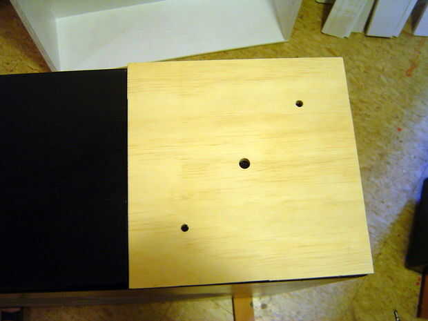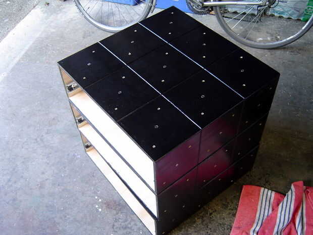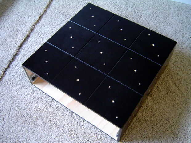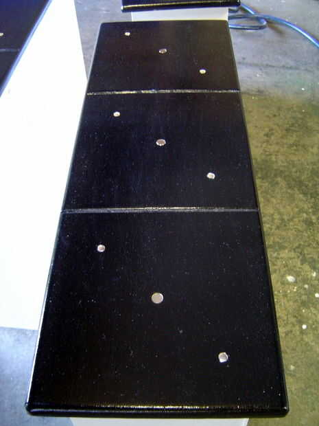 Usted necesitará utilizar una plantilla de nuevo. Utilice la plantilla anterior para hacer este; debe ser 200 x 200 mm. Haga los orificios para taquetes ligeramente más grandes (usado 15/64" para los orificios para taquetes y fue a 17/64" para éstos). Perforación a profundidad suficiente para que el imán a sentarse al ras con la superficie (convenientemente, esto fue apenas en la segunda capa de capas, por lo que sólo comentarlo), pero llevaba a través de todo el camino para los demás. Repetir 45 veces (no necesitas hacer la base, por razones obvias!). Pegar los imanes en los agujeros con una fina capa de epoxi.