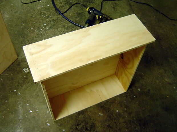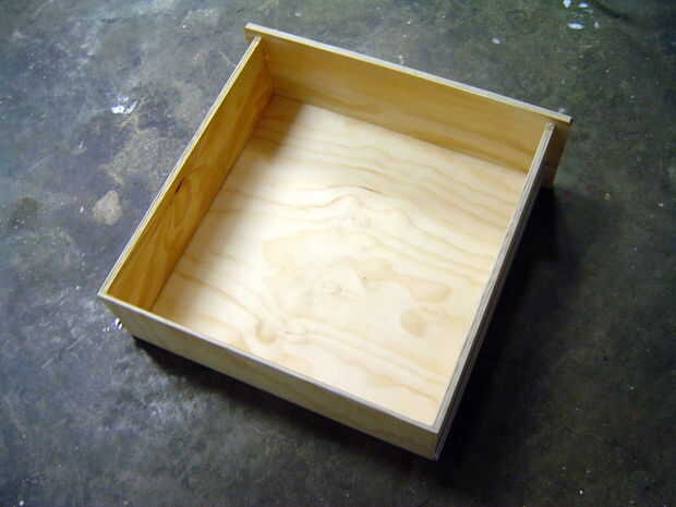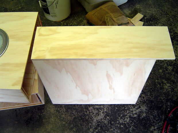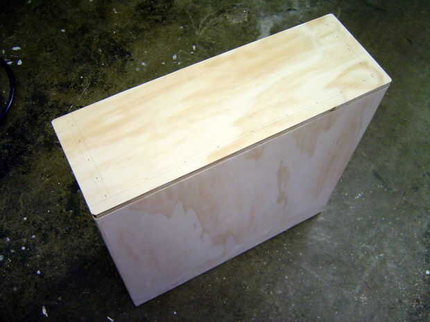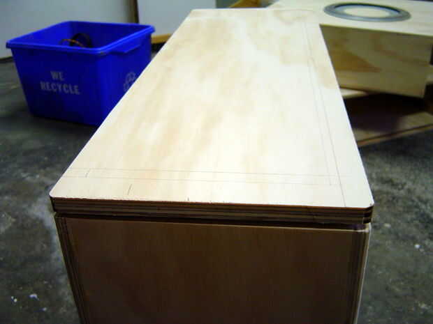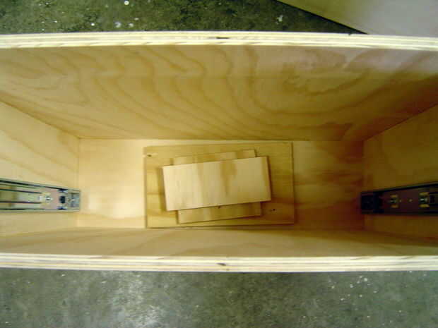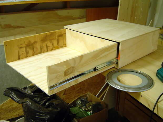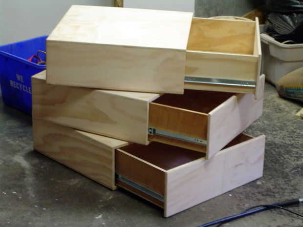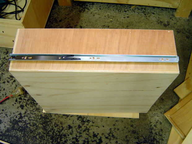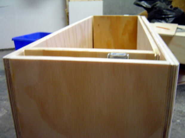 Coloque los cajones en las diapositivas y verifique el ajuste (si se deslizan y salen muy bien). Poner el caso en el extremo y algo cae detrás del cajón por lo que se sentará un poco orgullosos cuando está cerrado. El frente del cajón, y marca la línea y cortar para caber. Encolar y clavar el cajón, teniendo cuidado con los clavos (recomiendo transferir las líneas a la parte delantera para evitar errores). Los cantos del frente del cajón para emparejar el caso, eliminar la parada y la arena, rellenar y la arena otra vez.