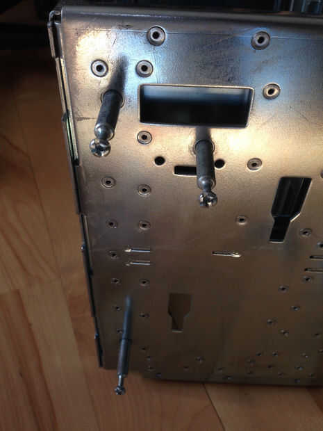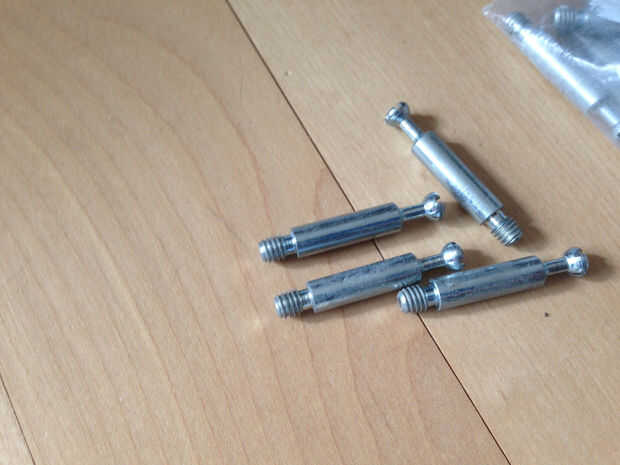 Yo quería Levante la unidad la mesa y estaba buscando algo enroscar en los agujeros roscados en la parte inferior de la unidad. Lo primero que probé, fueron algunos tornillos interesantes (foto) de mi colección, que había venido de algunos equipos de oficina surplussed desmontado un tiempo atrás. Encajan perfectamente. Me encanta cuando eso suceda!