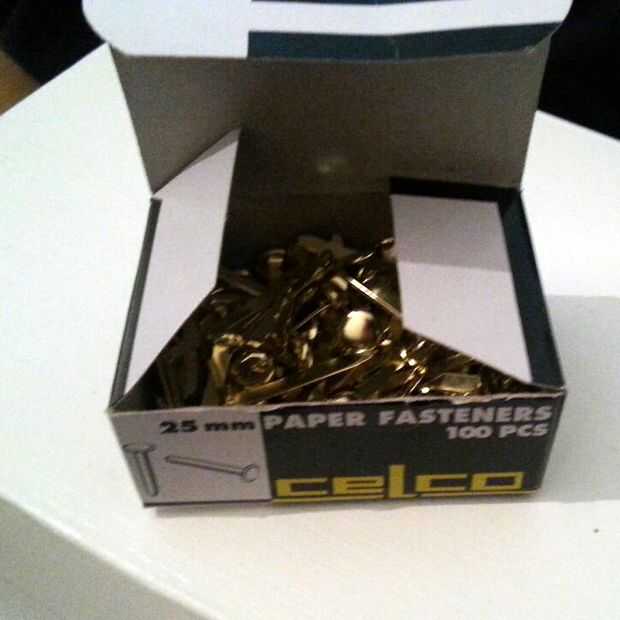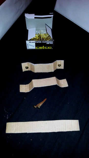 Así que tomé unas tiras más cartulina, doblando en cuatro lugares y otra vez, con celco clips usados para pegarlas (muy efectiva) al frente de los cajones.